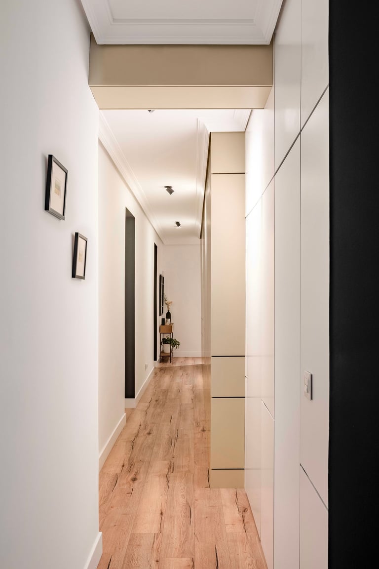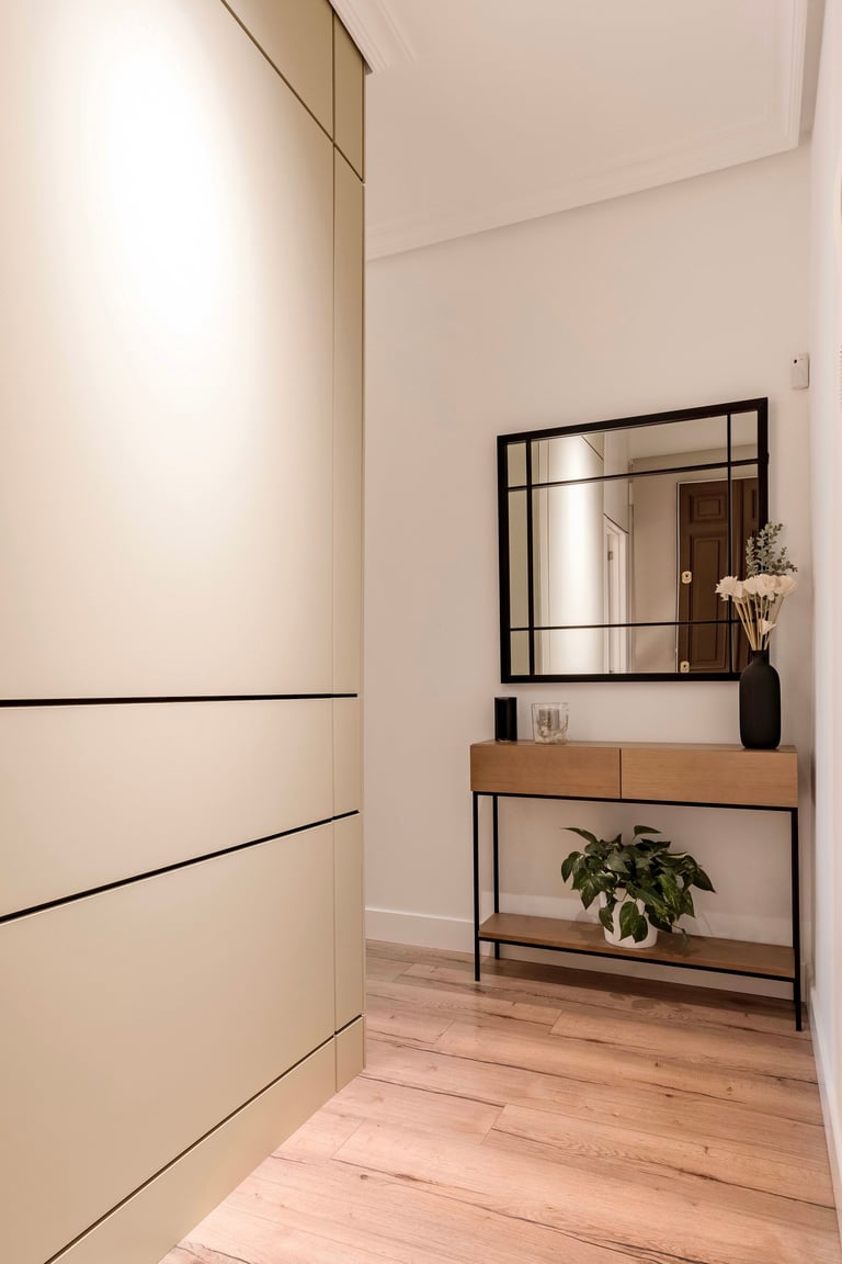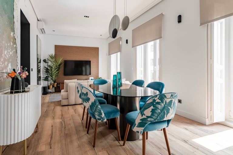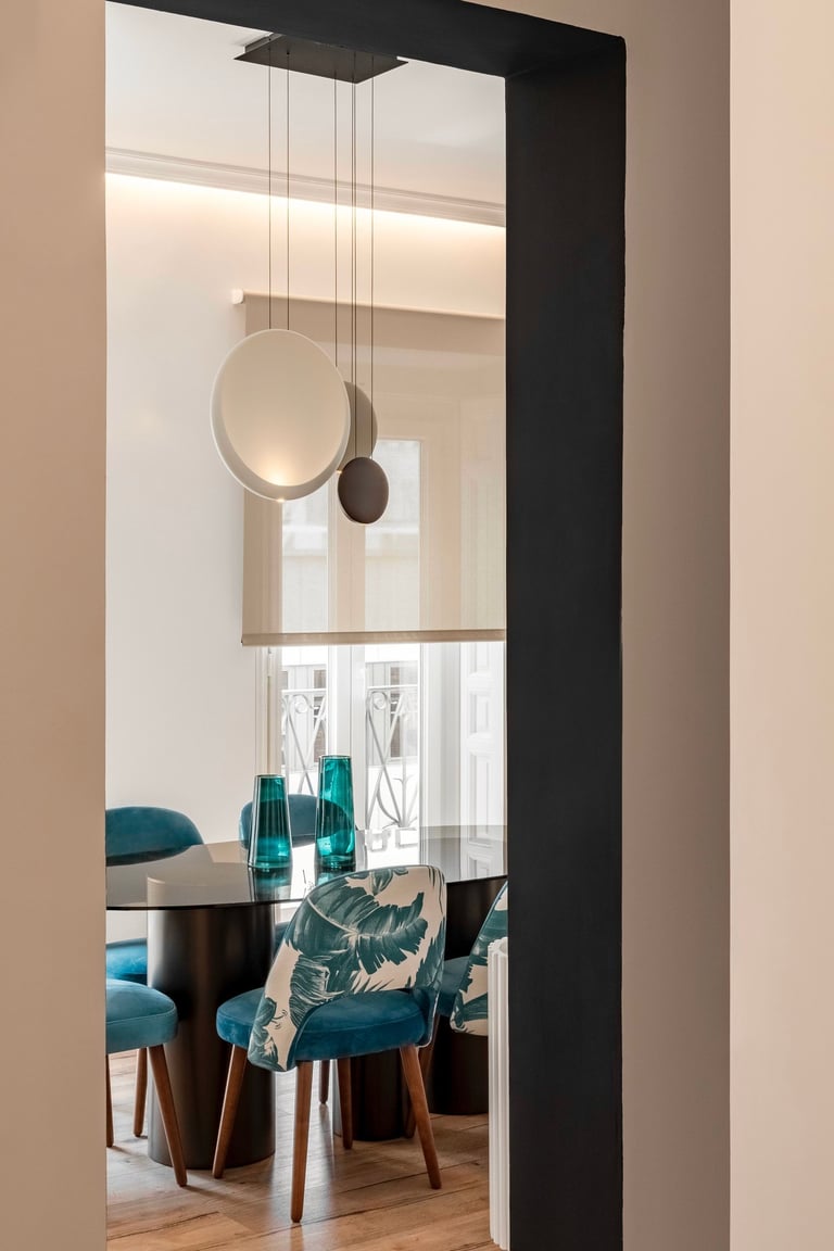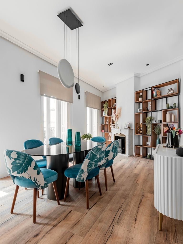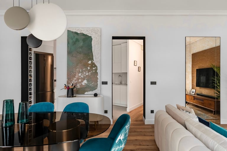 En este proyecto en el barrio de Argüelles nos encargamos del interiorismo, la decoración y el diseño de mobiliario. En la zona del recibidor y el pasillo diseñamos un panelado en verde haba y blanco con entrecalles negras y juegos geométricos que ocultan las puertas a los dormitorios y en la pared opuesta se han resaltado en negro las embocaduras de las puertas que dan al despacho, vestidor y cocina. En la zona de salón-comedor son diseños propios del estudio: la mesa de comedor con cilindros metálicos y cristal ahumado, las sillas tapizadas en terciopelo azul, las estanterías de forja negra con cubos de madera, el panelado de madera de nogal para la televisión, el aparador blanco con palillería y el espejo envejecido del mismo tamaño que las dos embocaduras marcadas en negro que dan paso a la cocina y al pasillo. En los dormitorios se han diseñado los cabeceros acolchados de lado a lado de la pared y en el despacho se ha diseñado un mueble bajo con palillería así como una estantería a medida. También realizamos el proyecto de iluminación.