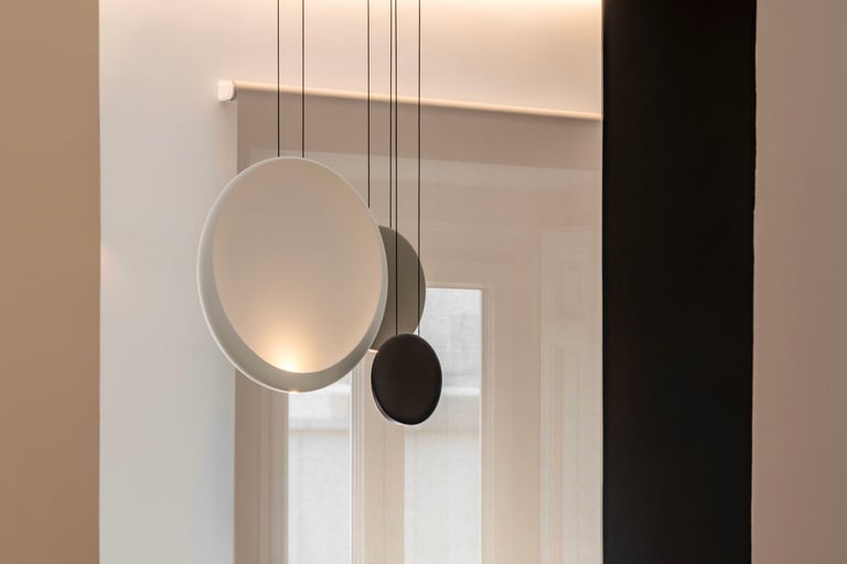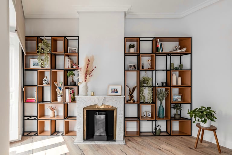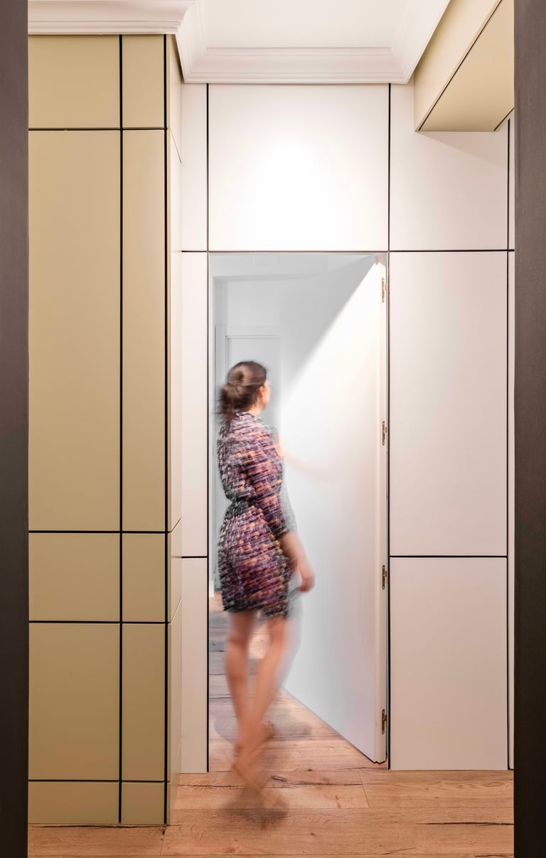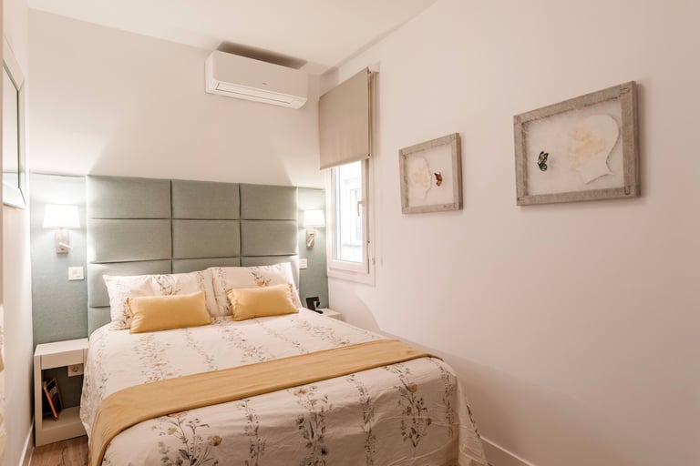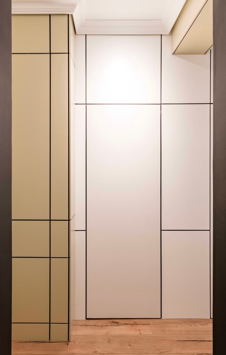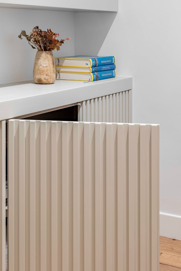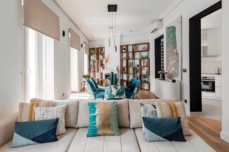 En este proyecto en el barrio de Argüelles nos encargamos del interiorismo, la decoración y el diseño de mobiliario. En la zona del recibidor y el pasillo diseñamos un panelado en verde haba y blanco con entrecalles negras y juegos geométricos que ocultan las puertas a los dormitorios y en la pared opuesta se han resaltado en negro las embocaduras de las puertas que dan al despacho, vestidor y cocina. En la zona de salón-comedor son diseños propios del estudio: la mesa de comedor con cilindros metálicos y cristal ahumado, las sillas tapizadas en terciopelo azul, las estanterías de forja negra con cubos de madera, el panelado de madera de nogal para la televisión, el aparador blanco con palillería y el espejo envejecido del mismo tamaño que las dos embocaduras marcadas en negro que dan paso a la cocina y al pasillo. En los dormitorios se han diseñado los cabeceros acolchados de lado a lado de la pared y en el despacho se ha diseñado un mueble bajo con palillería así como una estantería a medida. También realizamos el proyecto de iluminación.