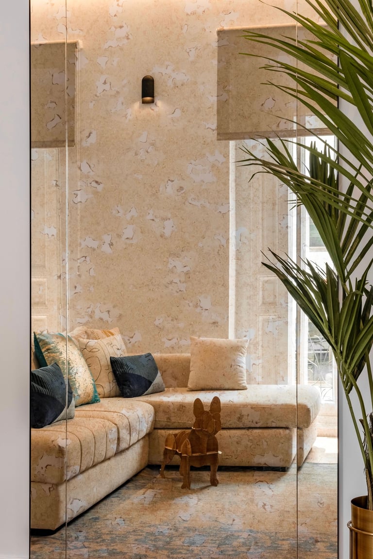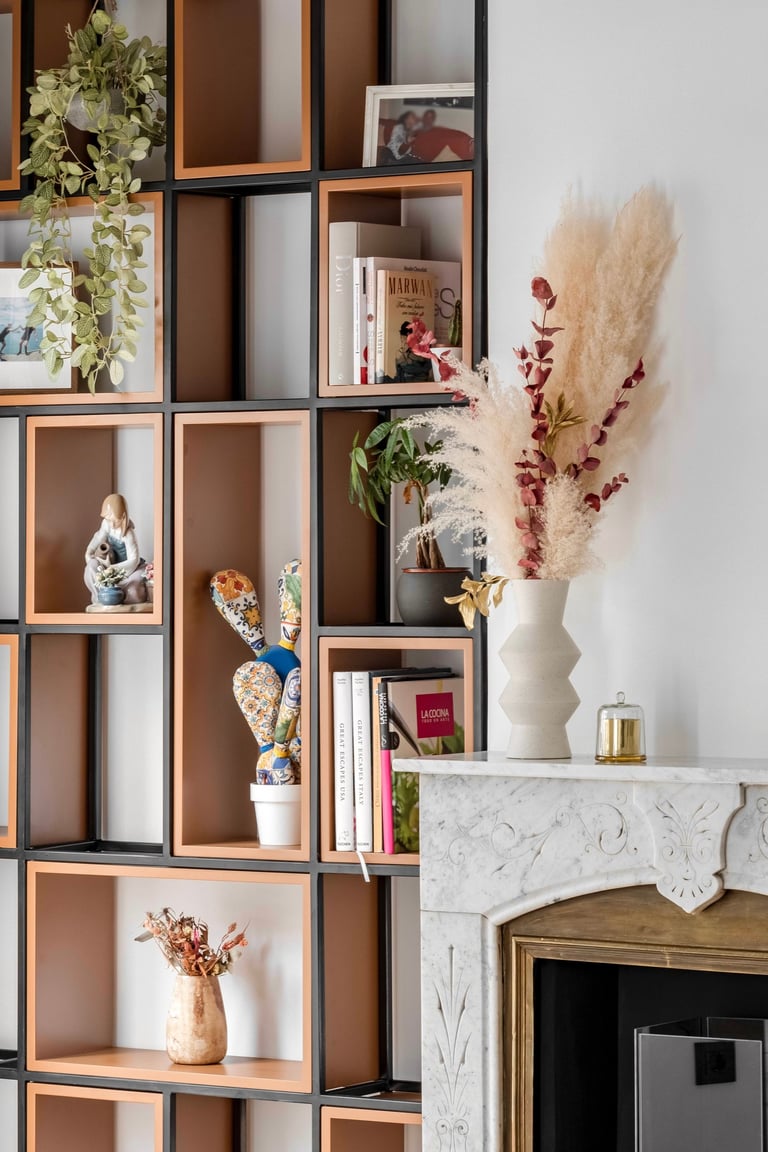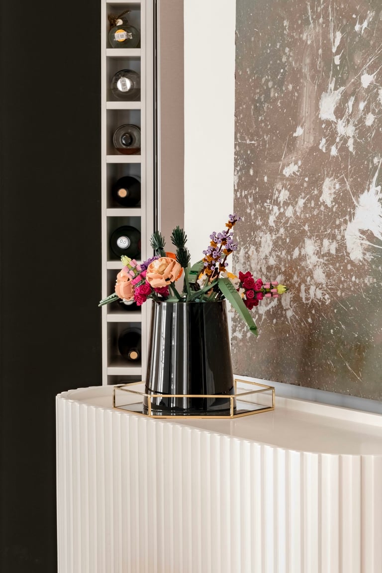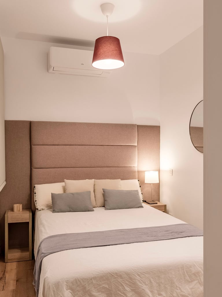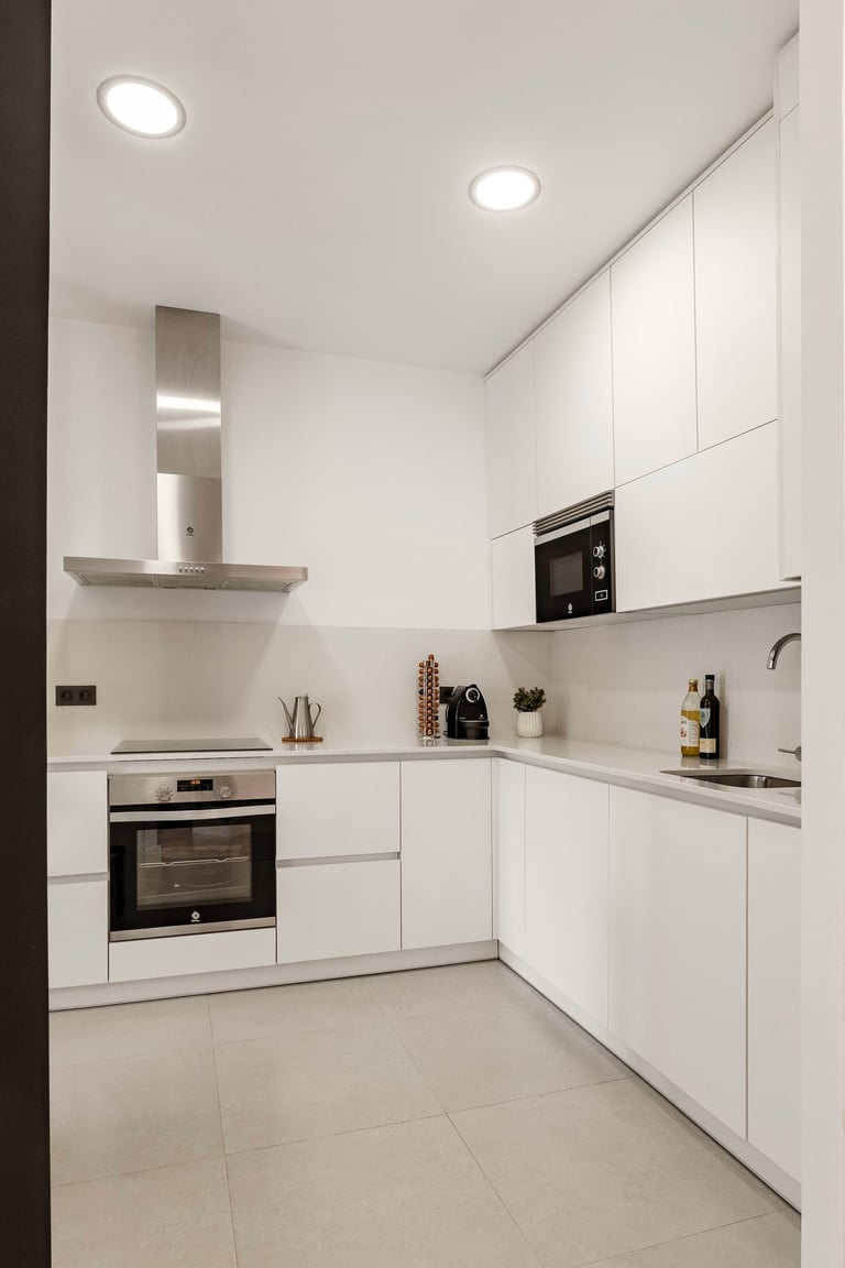 En este proyecto en el barrio de Argüelles nos encargamos del interiorismo, la decoración y el diseño de mobiliario. En la zona del recibidor y el pasillo diseñamos un panelado en verde haba y blanco con entrecalles negras y juegos geométricos que ocultan las puertas a los dormitorios y en la pared opuesta se han resaltado en negro las embocaduras de las puertas que dan al despacho, vestidor y cocina. En la zona de salón-comedor son diseños propios del estudio: la mesa de comedor con cilindros metálicos y cristal ahumado, las sillas tapizadas en terciopelo azul, las estanterías de forja negra con cubos de madera, el panelado de madera de nogal para la televisión, el aparador blanco con palillería y el espejo envejecido del mismo tamaño que las dos embocaduras marcadas en negro que dan paso a la cocina y al pasillo. En los dormitorios se han diseñado los cabeceros acolchados de lado a lado de la pared y en el despacho se ha diseñado un mueble bajo con palillería así como una estantería a medida. También realizamos el proyecto de iluminación.