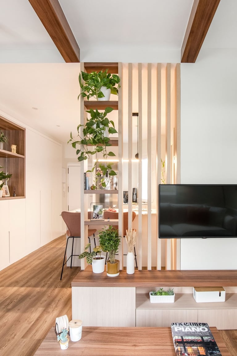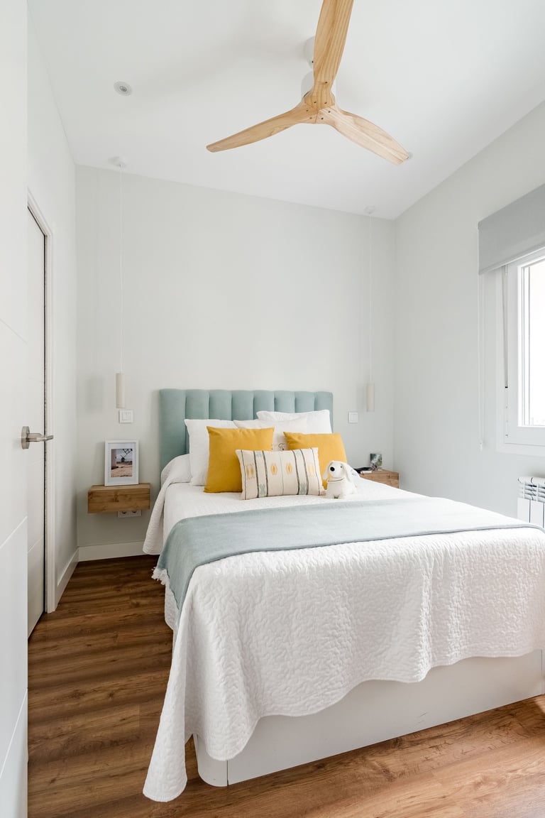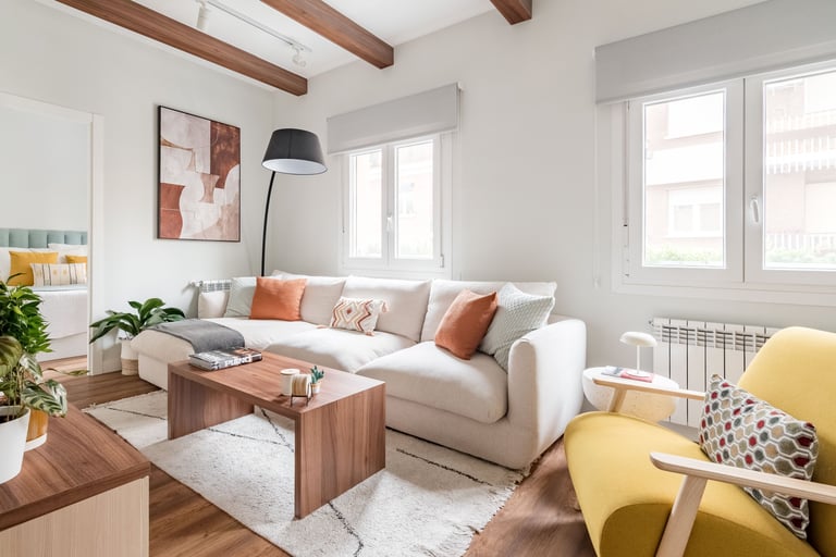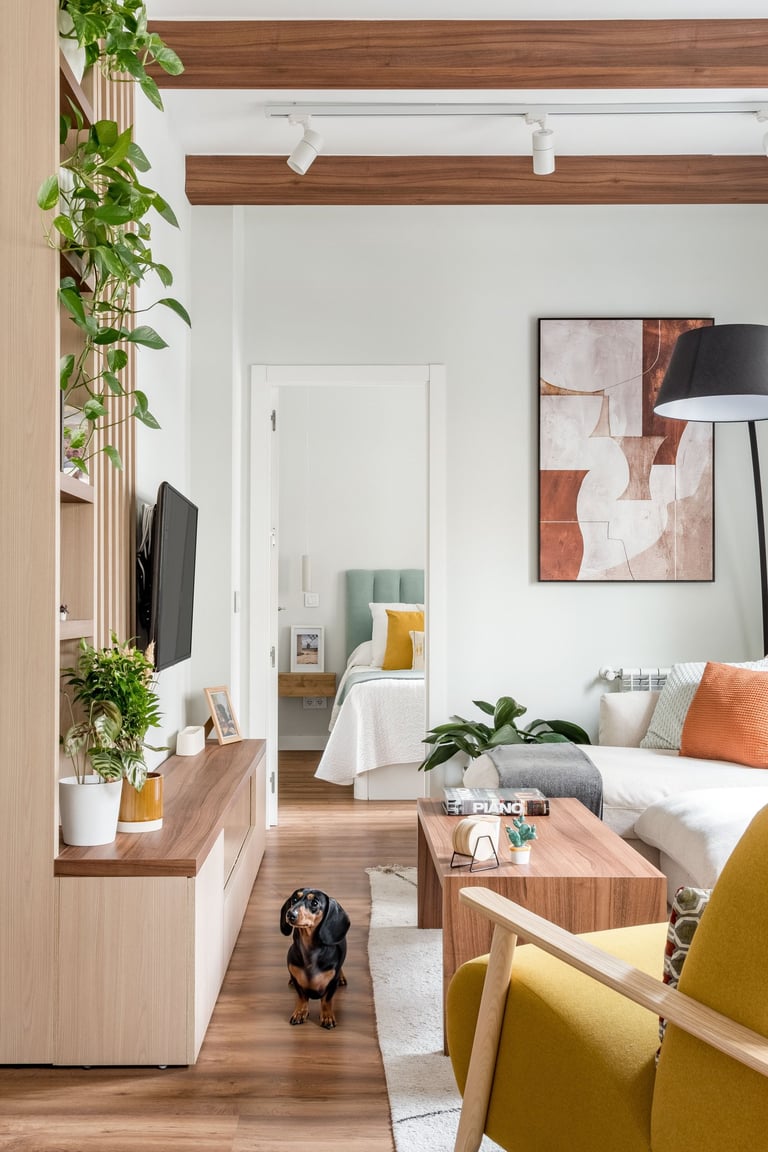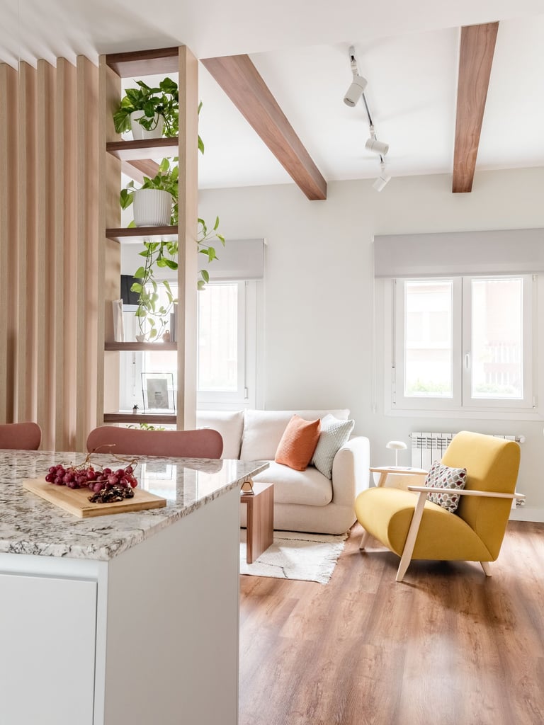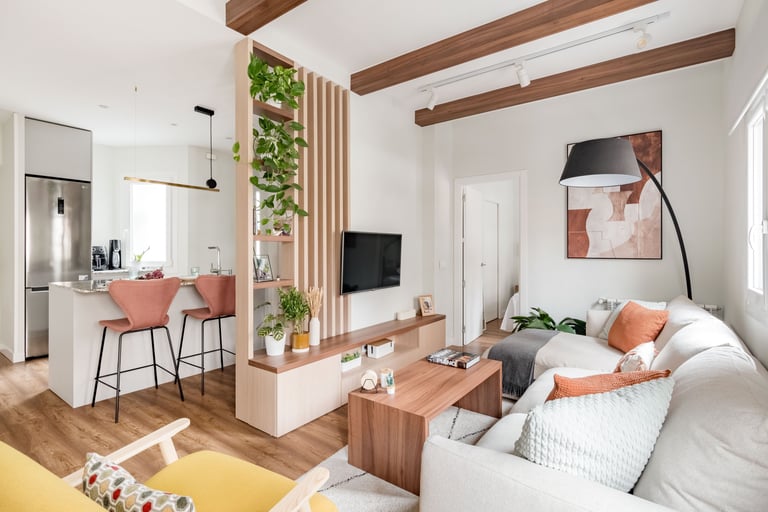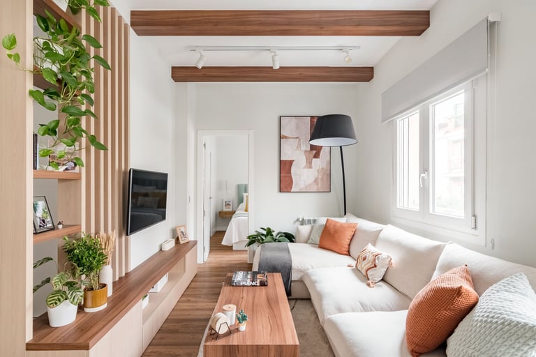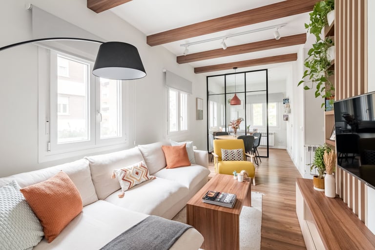También nos encargamos de diseñar un mueble a medida para el frente de TV, creando una separación entre la zona de estar y la cocina, ocultando así el acceso al aseo y la visión de la puerta de entrada desde el salón. Añadimos unas vigas decorativas aprovechando la diferencia de altura de los techos para darle un toque acogedor y nos ocupamos de seleccionar un mobiliario funcional y unos textiles alegres, de acuerdo con la personalidad de nuestros clientes y su mascota.