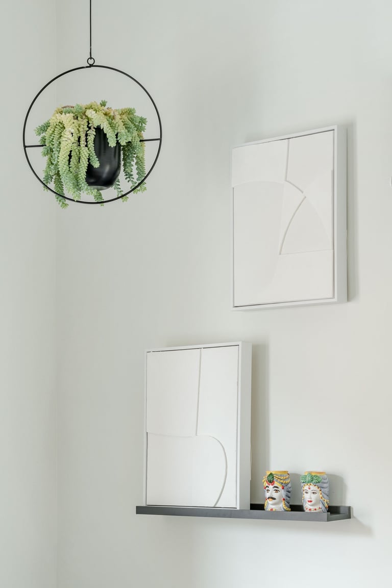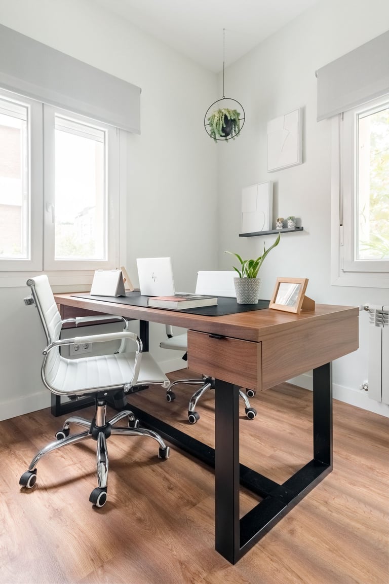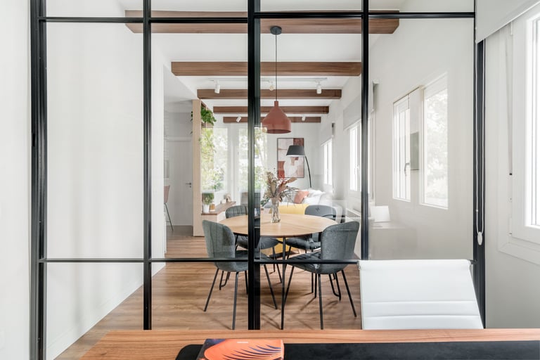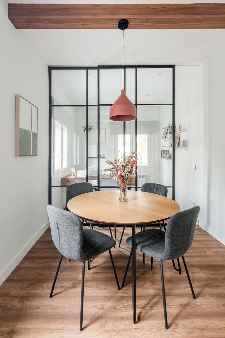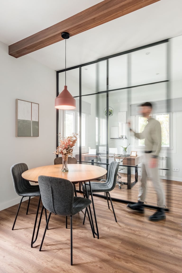 Nos pidieron ayuda con el interiorismo. Les propusimos un pequeño cambio en la distribución, minimizando las obras a realizar, pero logrando una gran transformación para su día a día: sustituir el tabique de una de las habitaciones que no necesitaban por un cerramiento de vidrio y metal, generando así una zona de despacho integrada con el resto de la zona de día. De esta manera se consiguió maximizar la luz en el área central de la vivienda, añadiendo un cómodo espacio para trabajar desde casa.