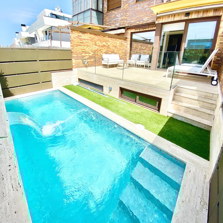 El encargo que recibimos para este adosado en Villaviciosa de Odón consistía en realizar un nuevo diseño para las zonas exteriores incluyendo la creación de una pequeña piscina y con la condición de un bajo coste de mantenimiento. Logramos aprovechar el espacio al máximo y generar también una agradable zona de terraza para tomar el sol.