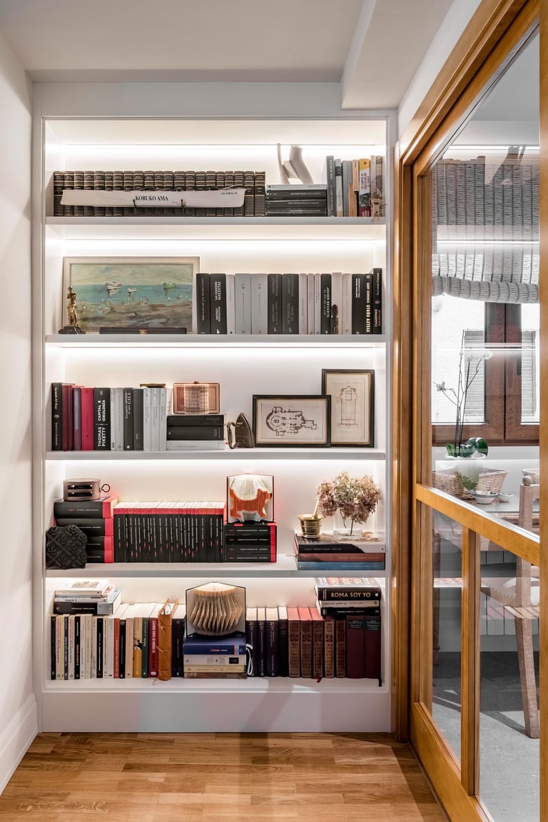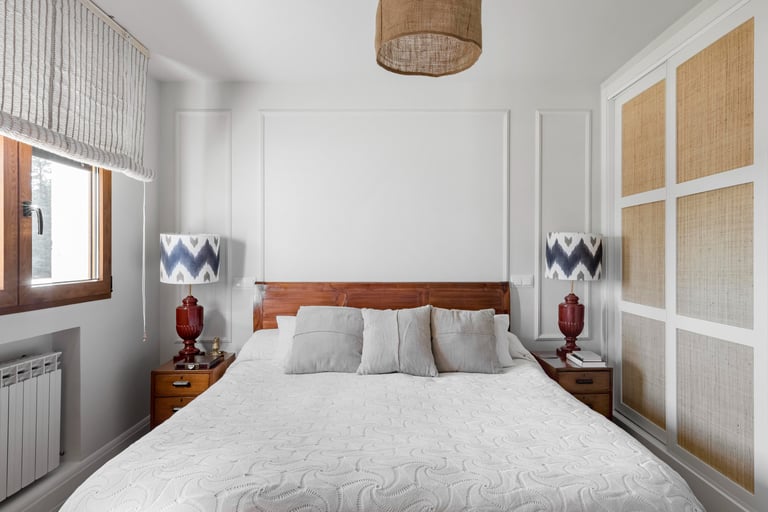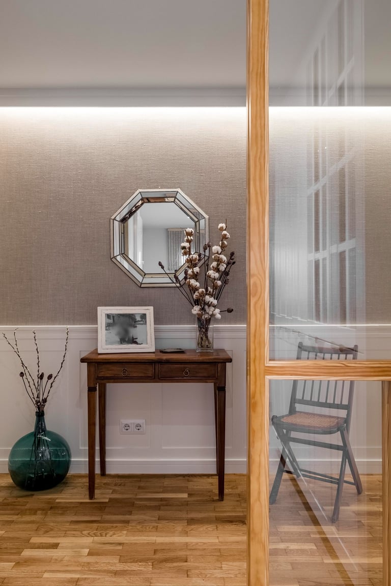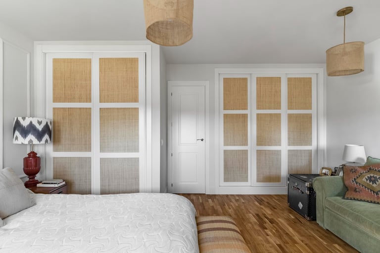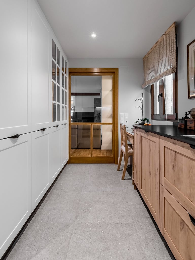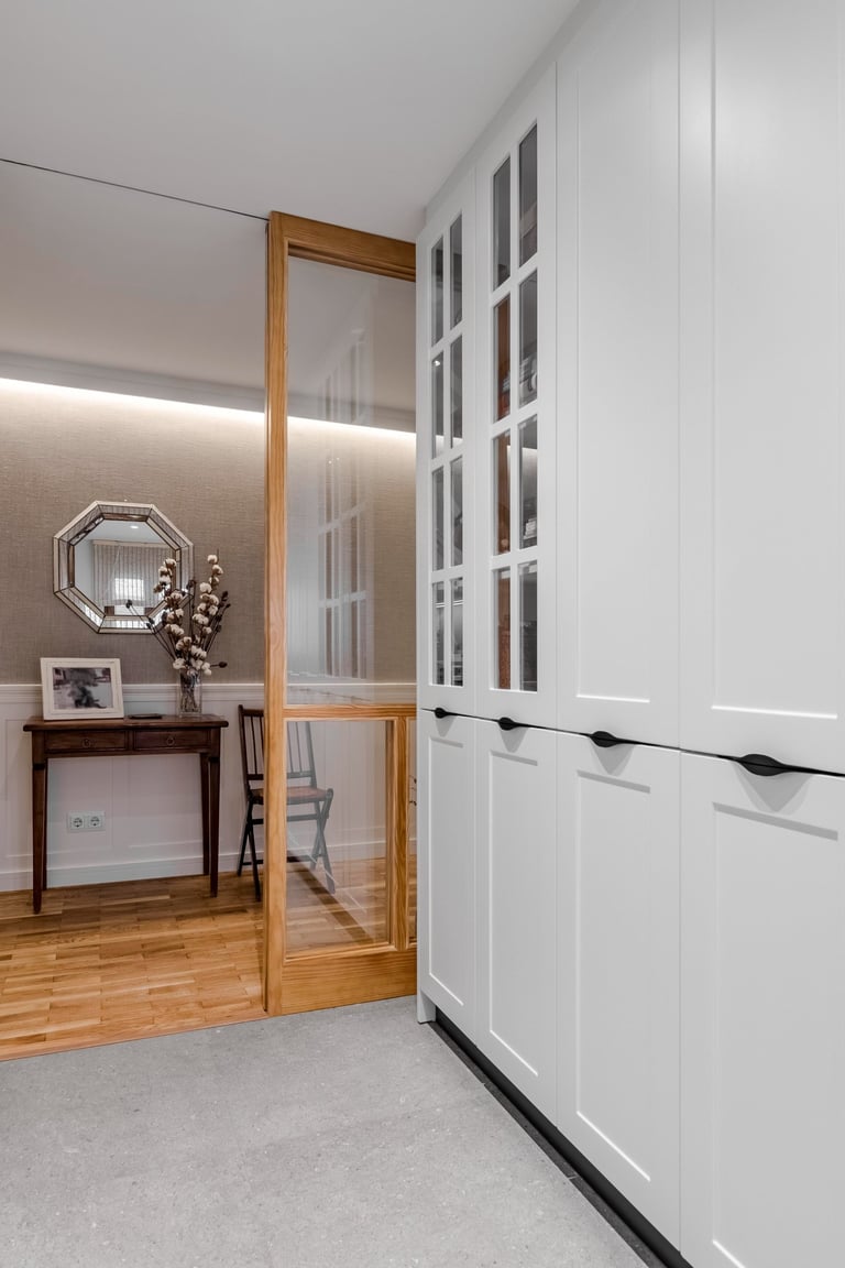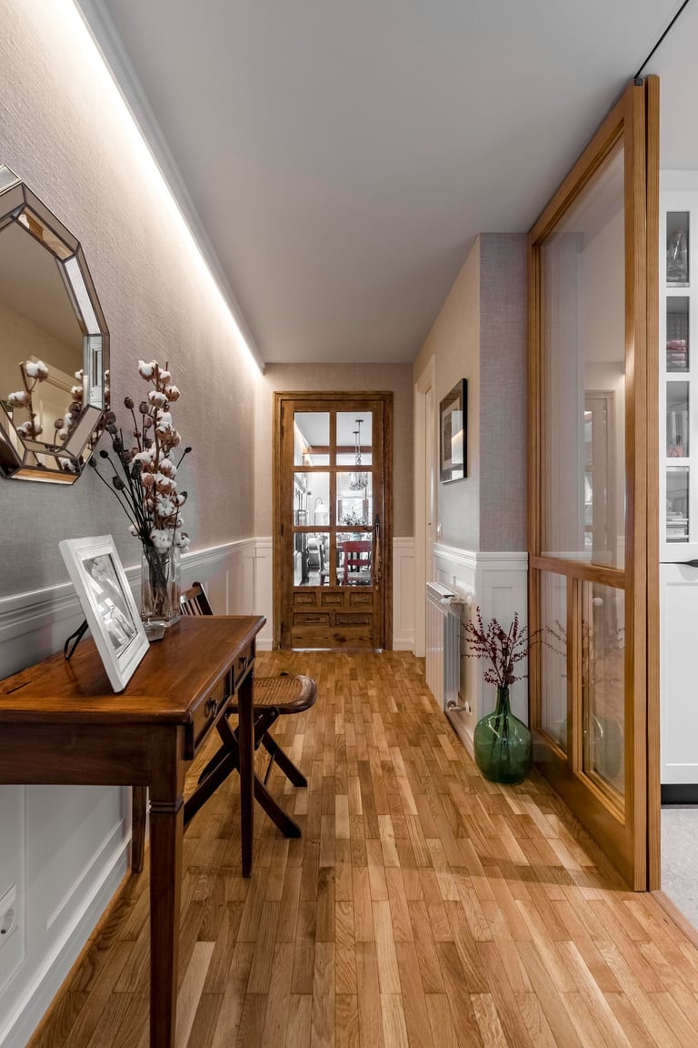 La actuación se centró principalmente en: el recibidor, al que dimos un toque de personalidad con un arrimadero en madera blanca y forrando las paredes con lino; la cocina, que ampliamos añadiéndole una habitación en desuso y reformamos por completo para conseguir que fuera luminosa, tuviera la posibilidad de abrirse al salón y contara con todo el espacio de almacenaje necesario; el salón-comedor, al que incorporamos una preciosa mesa elaborada a partir de una antigua puerta y donde añadimos iluminación indirecta rediseñando los techos y la estantería; el aseo, al que ganamos espacio para que resultara más funcional y la habitación principal, a la que añadimos unos nuevos armarios y unos pequeños detalles decorativos en la pared del cabecero para que estuviera en armonía con el estilo del resto de la vivienda.