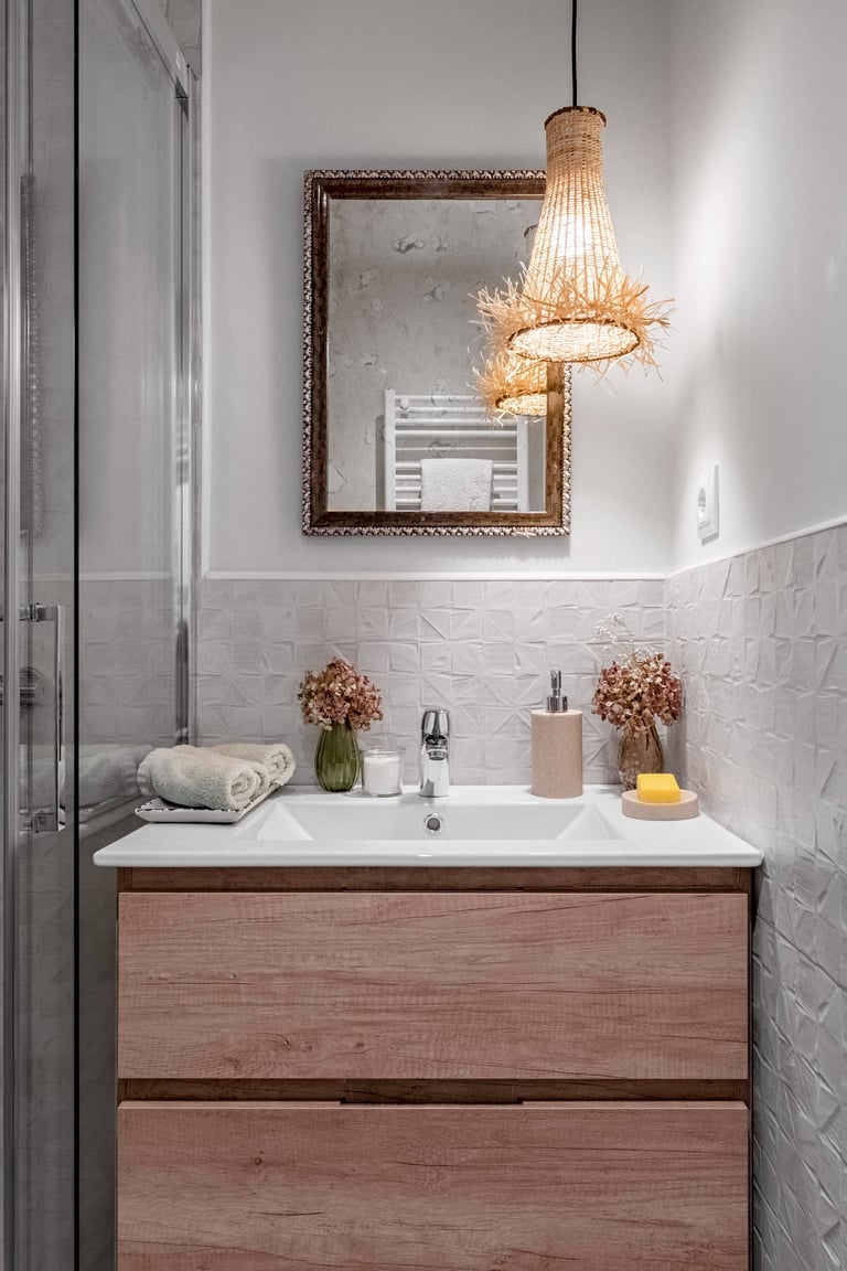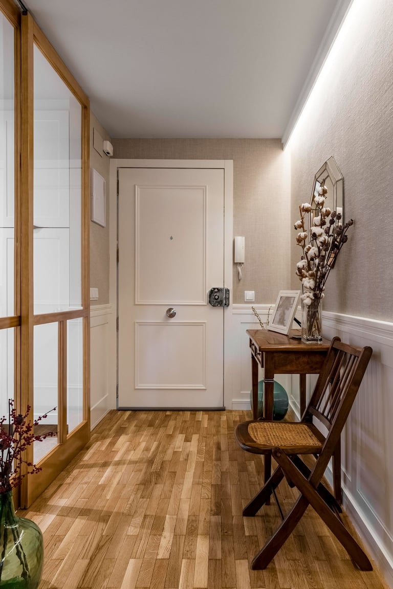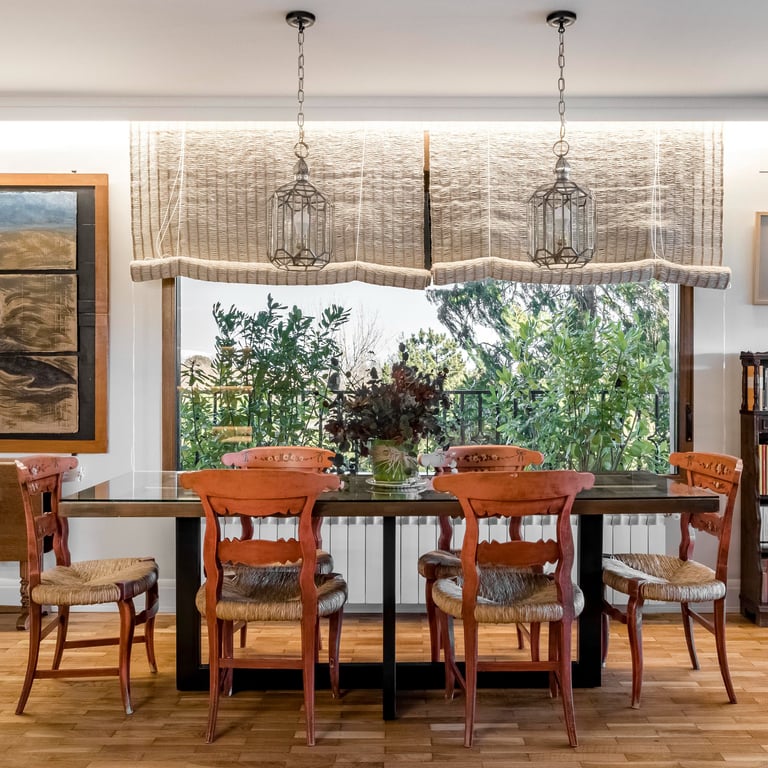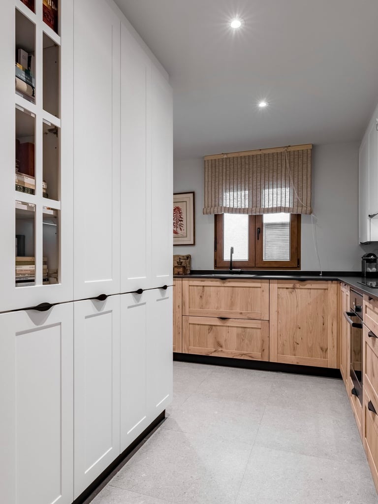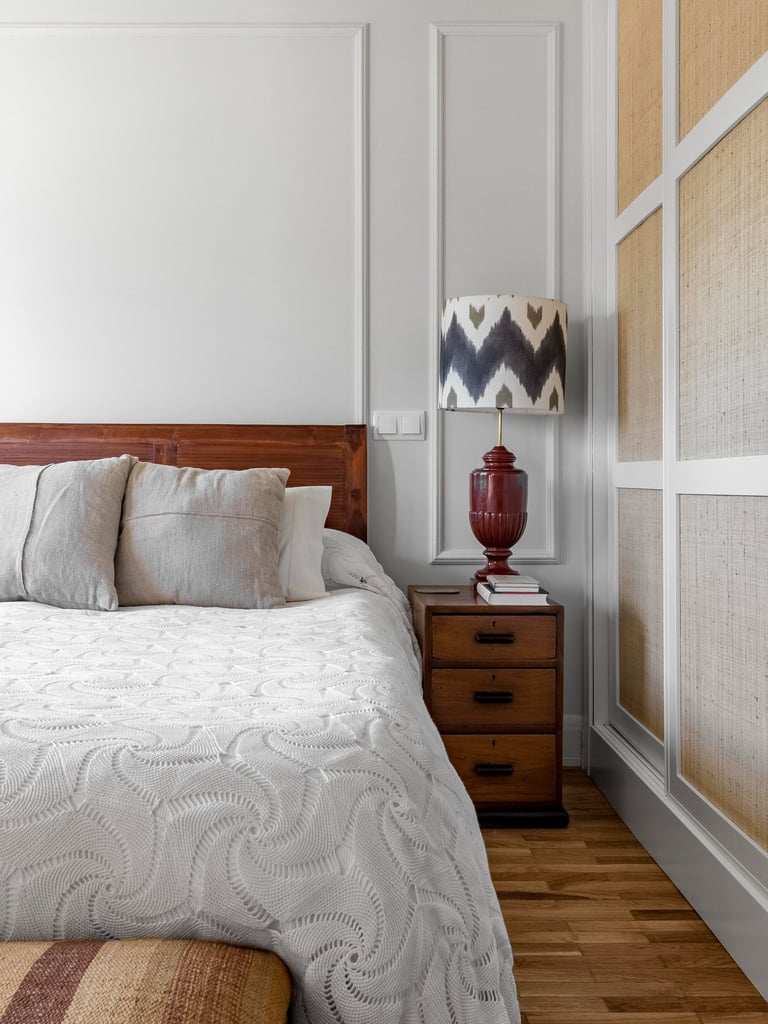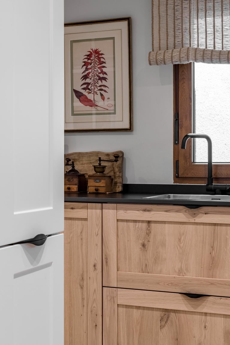 La actuación se centró principalmente en: el recibidor, al que dimos un toque de personalidad con un arrimadero en madera blanca y forrando las paredes con lino; la cocina, que ampliamos añadiéndole una habitación en desuso y reformamos por completo para conseguir que fuera luminosa, tuviera la posibilidad de abrirse al salón y contara con todo el espacio de almacenaje necesario; el salón-comedor, al que incorporamos una preciosa mesa elaborada a partir de una antigua puerta y donde añadimos iluminación indirecta rediseñando los techos y la estantería; el aseo, al que ganamos espacio para que resultara más funcional y la habitación principal, a la que añadimos unos nuevos armarios y unos pequeños detalles decorativos en la pared del cabecero para que estuviera en armonía con el estilo del resto de la vivienda.