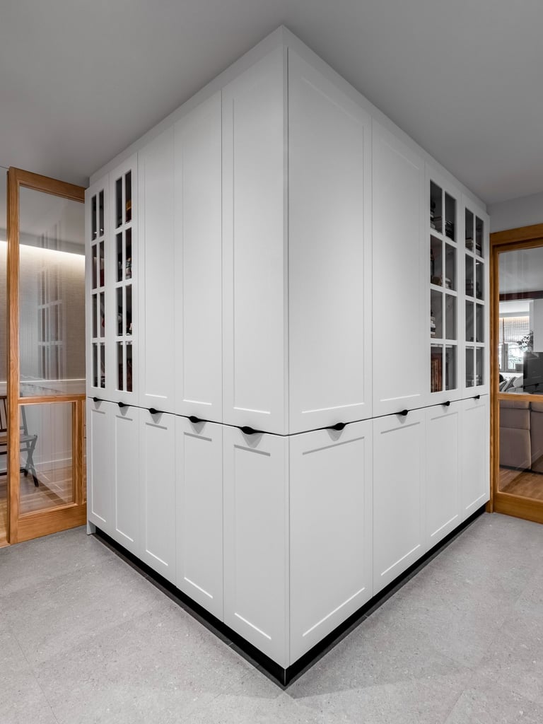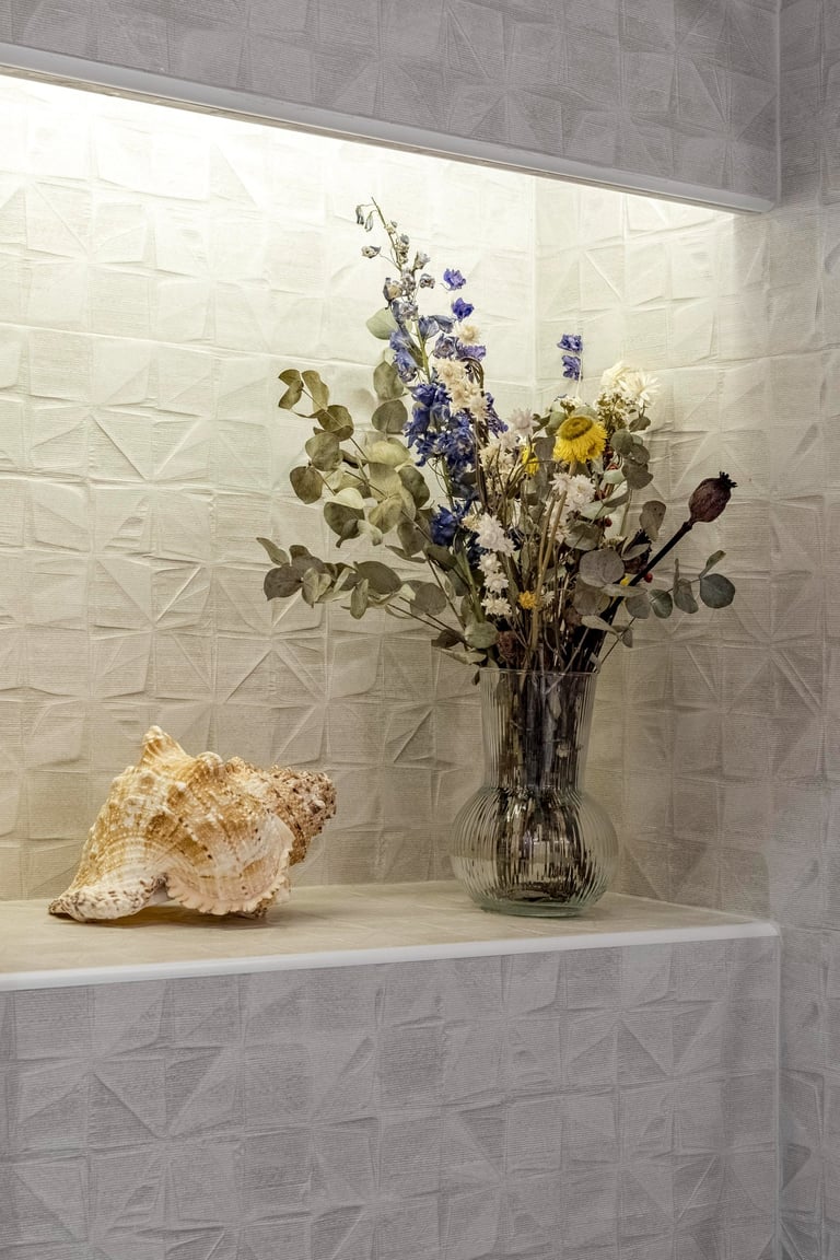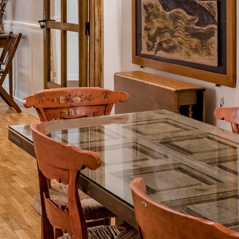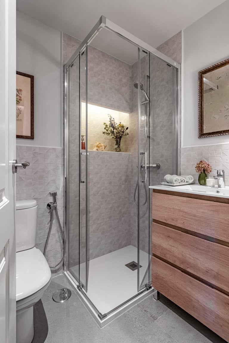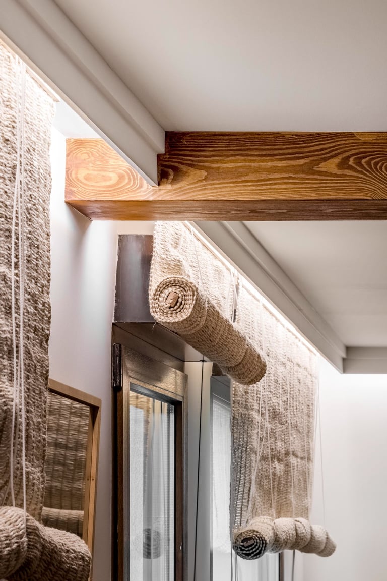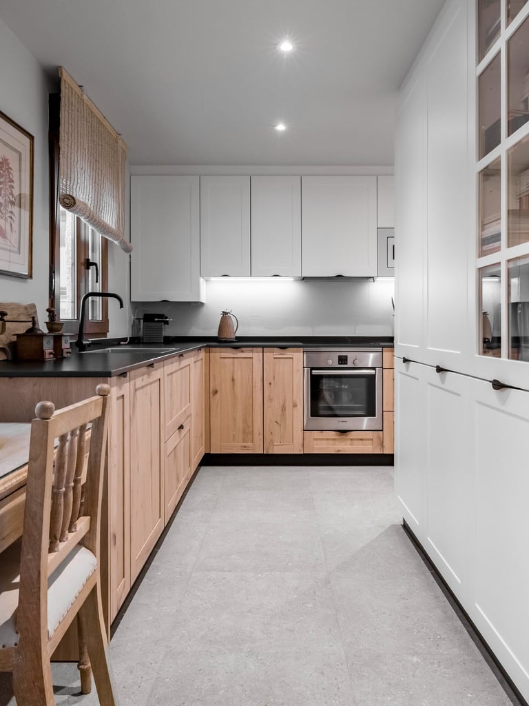 La actuación se centró principalmente en: el recibidor, al que dimos un toque de personalidad con un arrimadero en madera blanca y forrando las paredes con lino; la cocina, que ampliamos añadiéndole una habitación en desuso y reformamos por completo para conseguir que fuera luminosa, tuviera la posibilidad de abrirse al salón y contara con todo el espacio de almacenaje necesario; el salón-comedor, al que incorporamos una preciosa mesa elaborada a partir de una antigua puerta y donde añadimos iluminación indirecta rediseñando los techos y la estantería; el aseo, al que ganamos espacio para que resultara más funcional y la habitación principal, a la que añadimos unos nuevos armarios y unos pequeños detalles decorativos en la pared del cabecero para que estuviera en armonía con el estilo del resto de la vivienda.